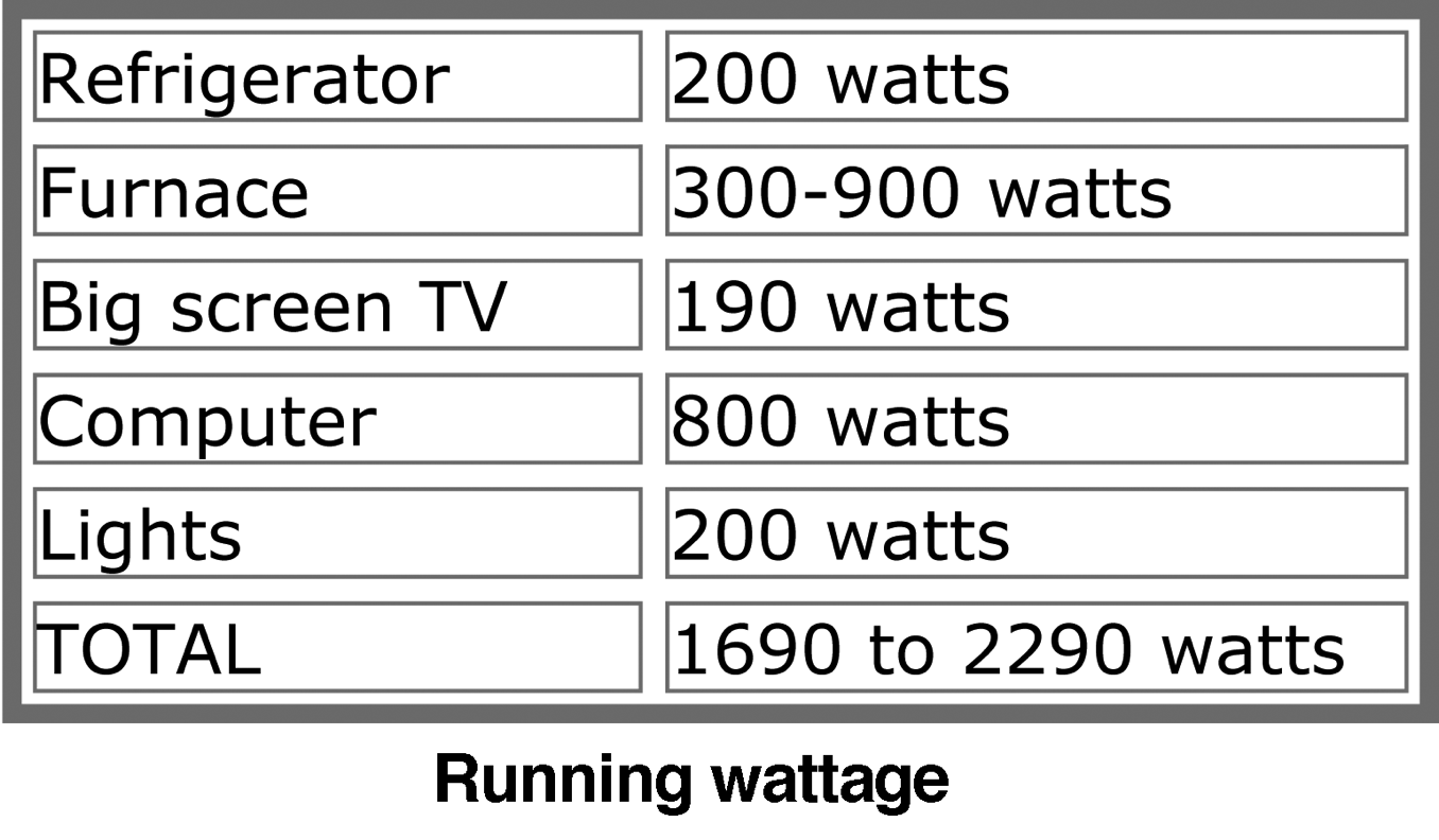 Appliances use more power starting up than when they are running, so I calculated the starting wattage so if everything went on at once, I would be OK.