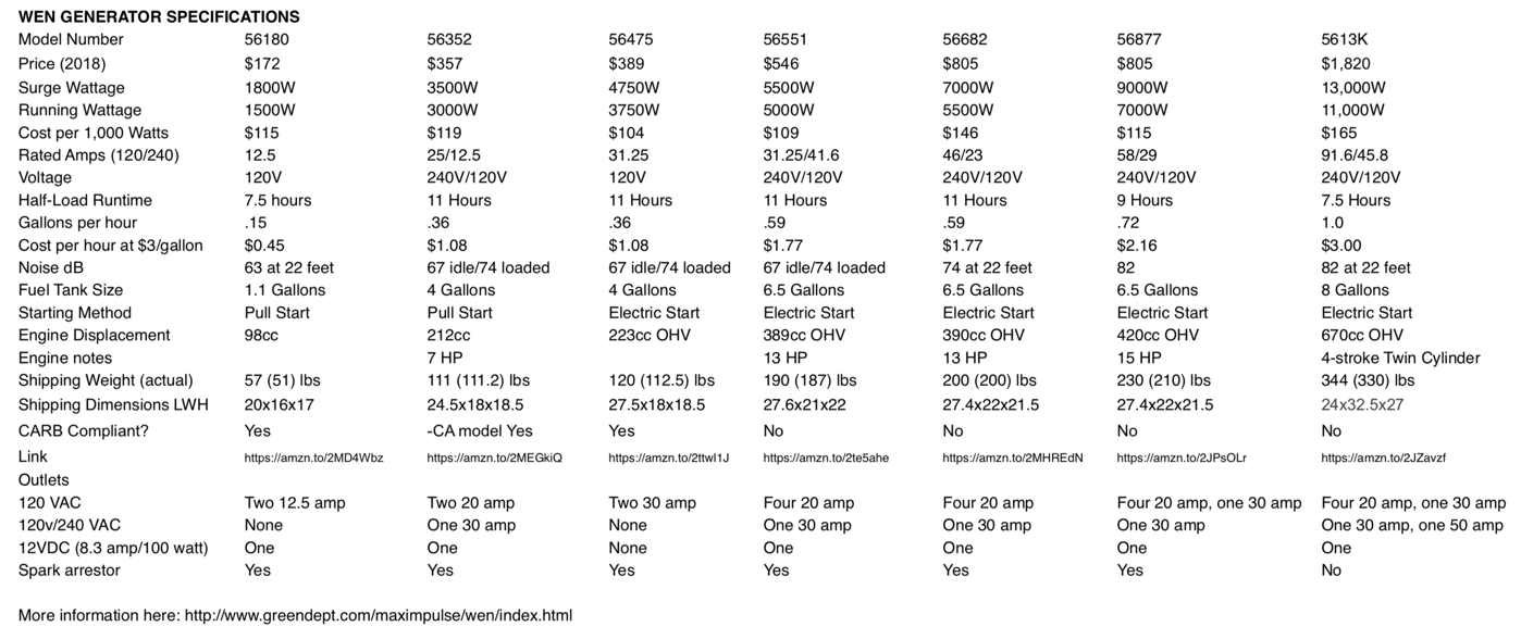 So I researched every generator I could find and the Wen got lots of positive and intelligent reviews at Amazon. Other generators near its price got mixed reviews, some good and some bad . Honda generators made me salivate, but the prices were 4 times higher. So I took the plunge and bought a WEN 3500 Gas Powered Portable Generator with Wheel Kit. You can go and read the reviews for yourself!