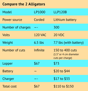 The other is the cordless LLP120B Alligator. It is a 20 volt model with an improved lithium battery. My old, original non-lithium batteries are still working fine after several years…and the new ones are even better!