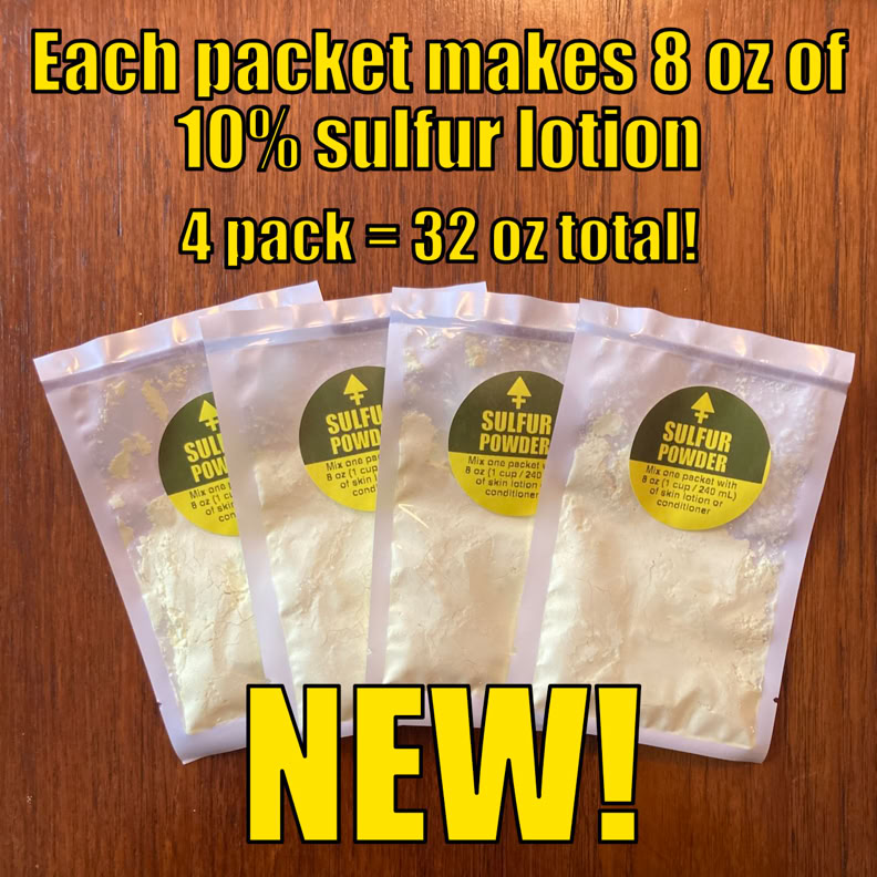 Instead, you can get pre-measured packets of sulfur powder, mix a packet with a cup of your preferred lotion and have a cup of 10% sulfur lotion. Easy! And cheap! And you get to use the lotion you choose.