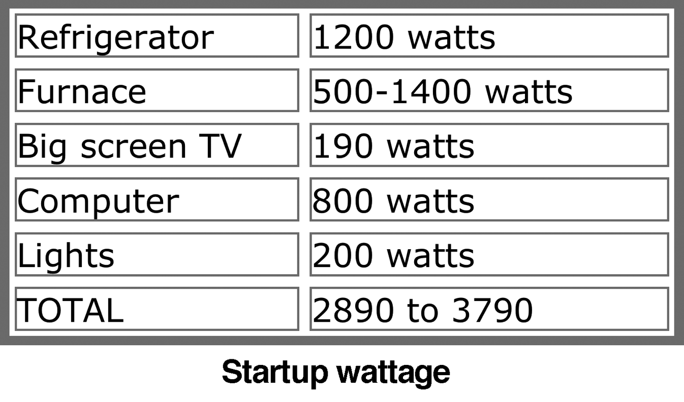 And that is a generic computer's wattage, I looked mine up and it uses under 300 watts, not 800. So my startup wattage is from about 2400 to 3300 watts.